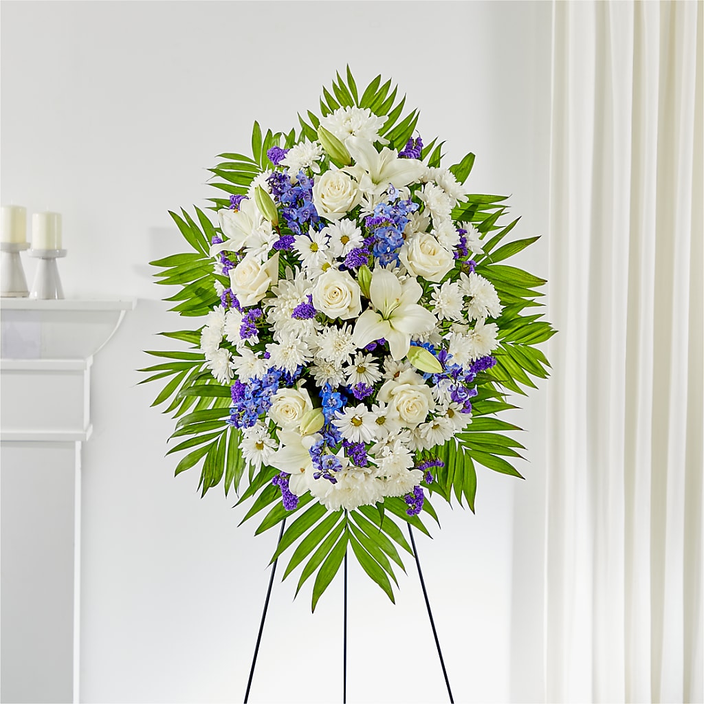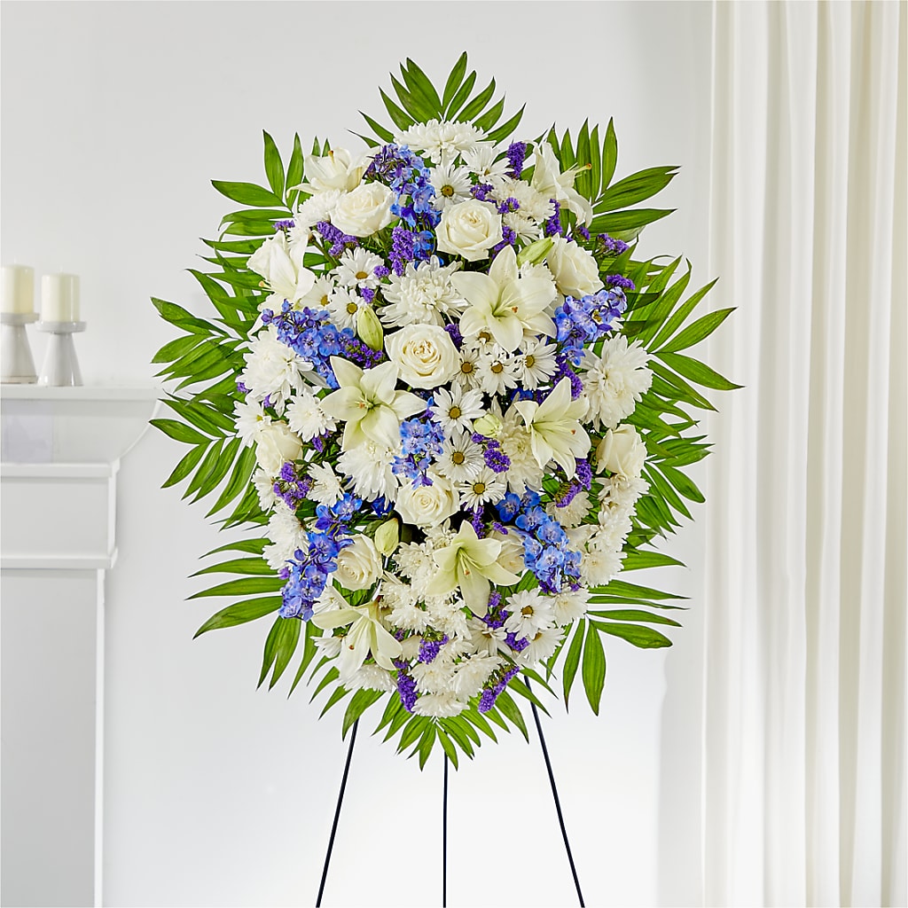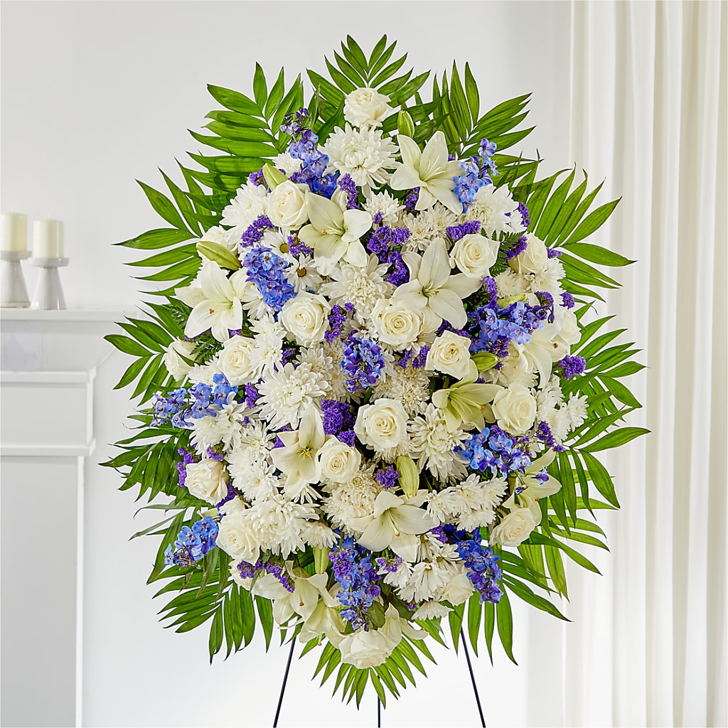 Presente sus respetos con un tributo permanente de flores blancas y azules, cuidadosamente diseñadas para expresar las palabras que pueden ser difíciles de encontrar.