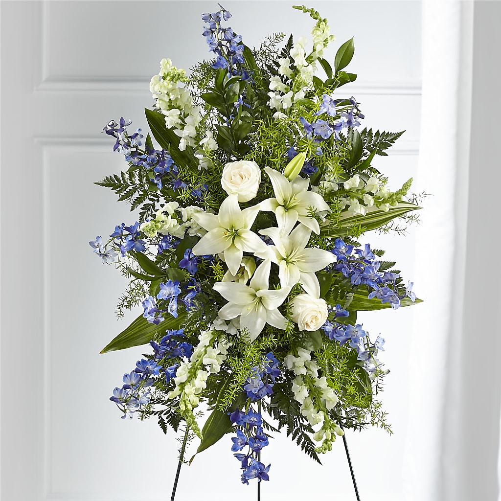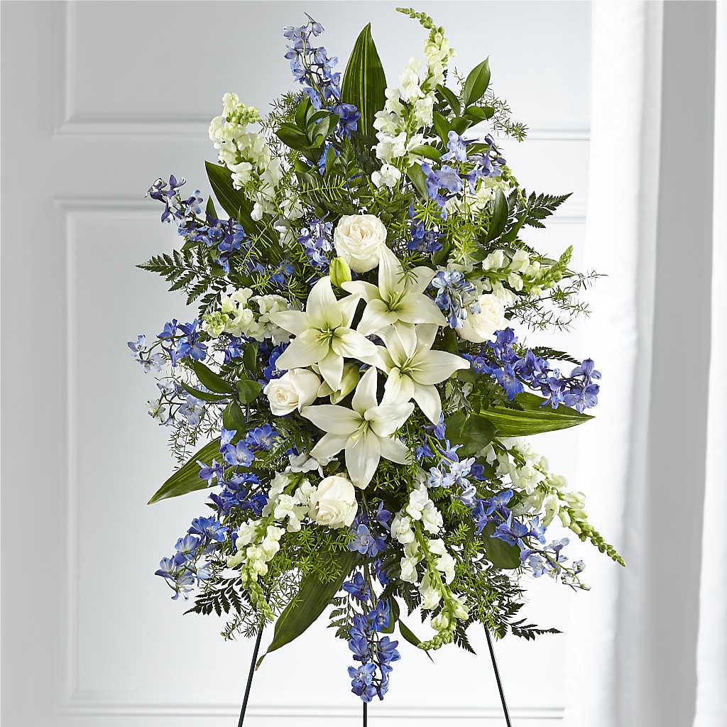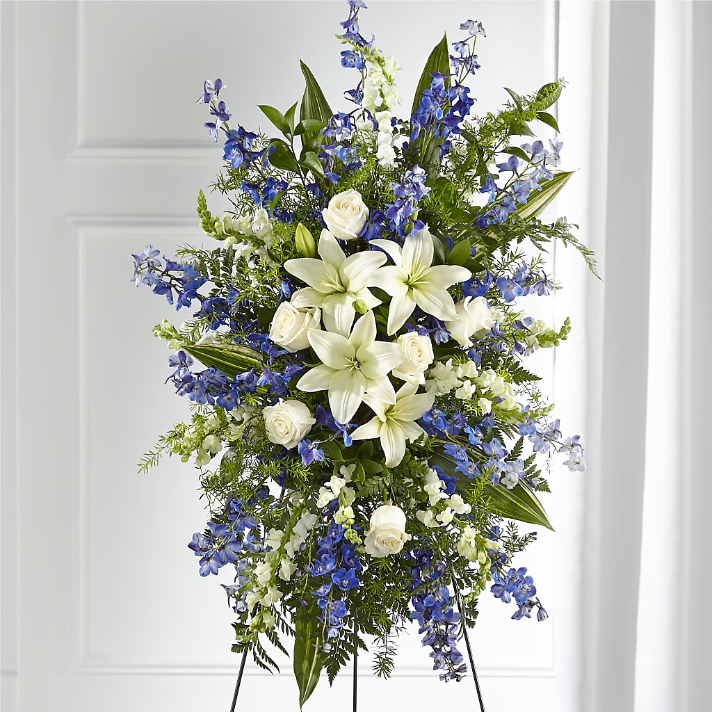 Una colección de vibrantes flores azules ofrece un homenaje indescriptible. Diseñado con lirios, rosas, delphinium y boca de dragón, nuestro arreglo floral "Amigo Fiel" es un gran gesto para expresar amabilidad y consuelo a un ser querido.