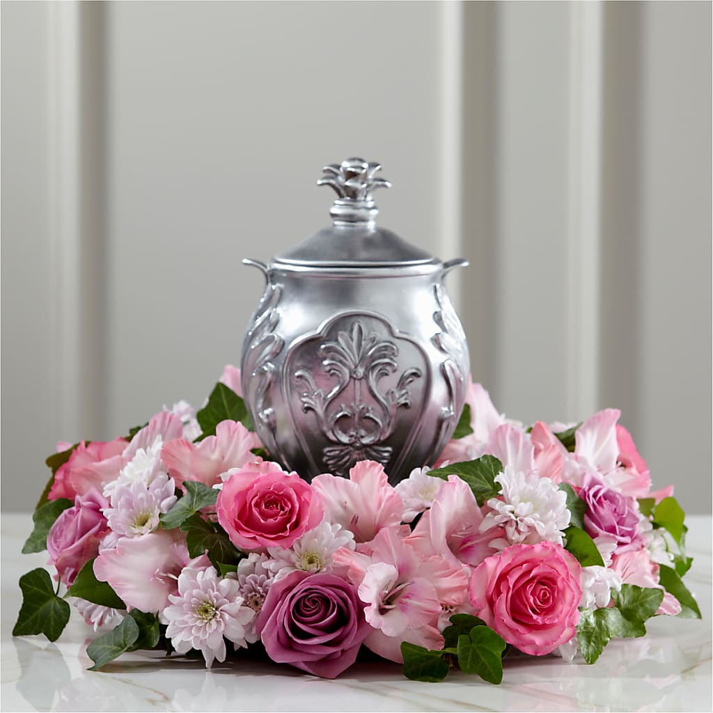 Una corona de hermosas flores frescas en tonos pastel crea un ambiente brillante y vibrante para una urna que contiene los restos cremados de un ser querido para un velatorio, un funeral o un servicio conmemorativo. La corona está hecha a mano con pompones de cojín color lavanda, gladiolos rosas y rosas rosas y lavanda sobre una base de verdes jaspeados con una base plana para mayor estabilidad sobre una mesa o un altar. También puede usarse para realzar la exhibición de estatuas religiosas, una fotografía o recuerdo significativo, o un candelabro.