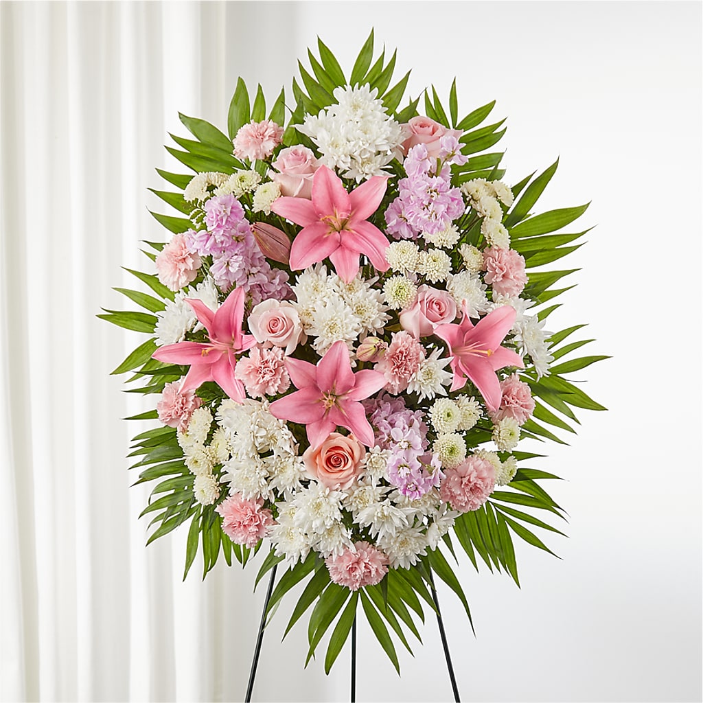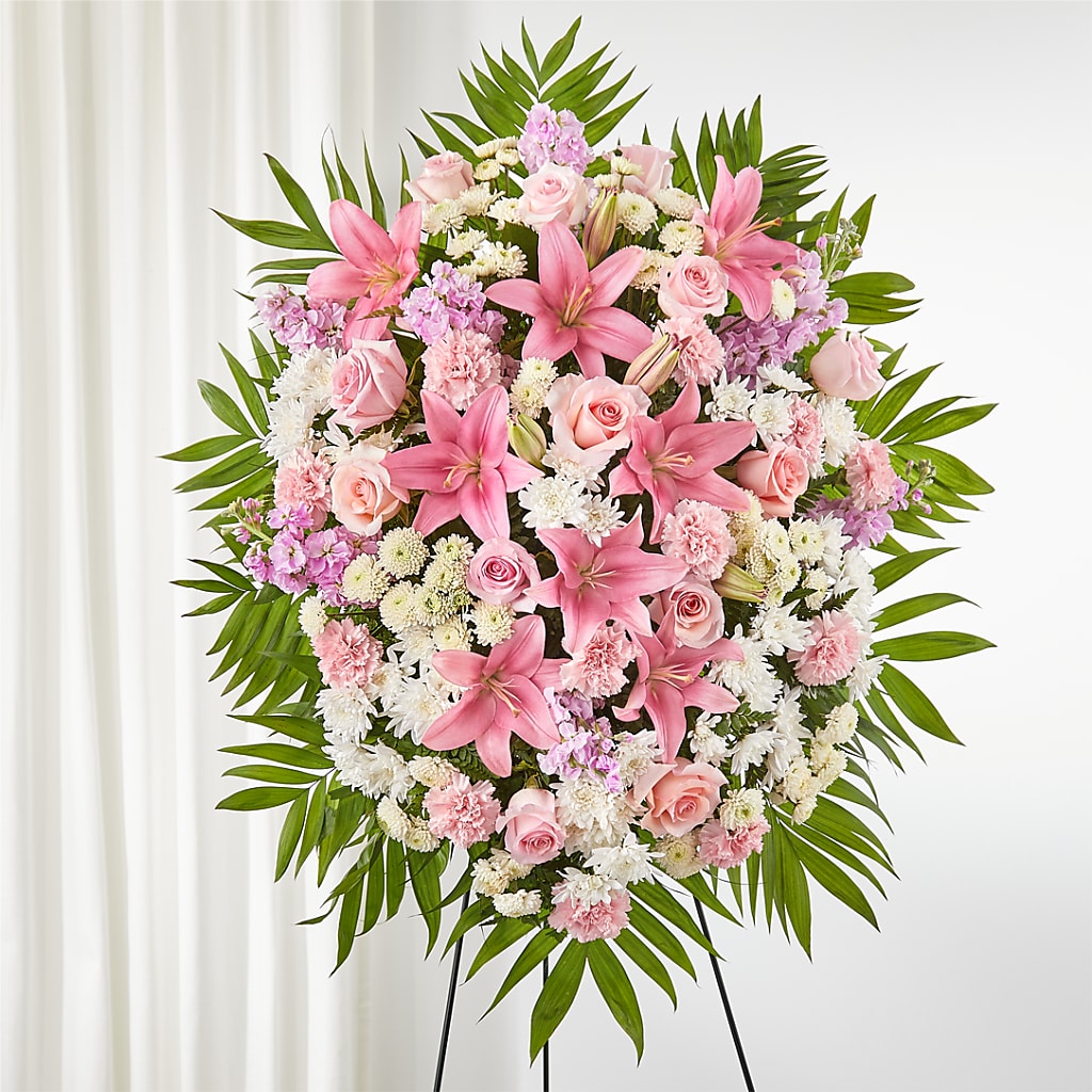 Flores rosas y blancas dispuestas ingeniosamente crean un cautivador arreglo floral para honrar una hermosa vida.