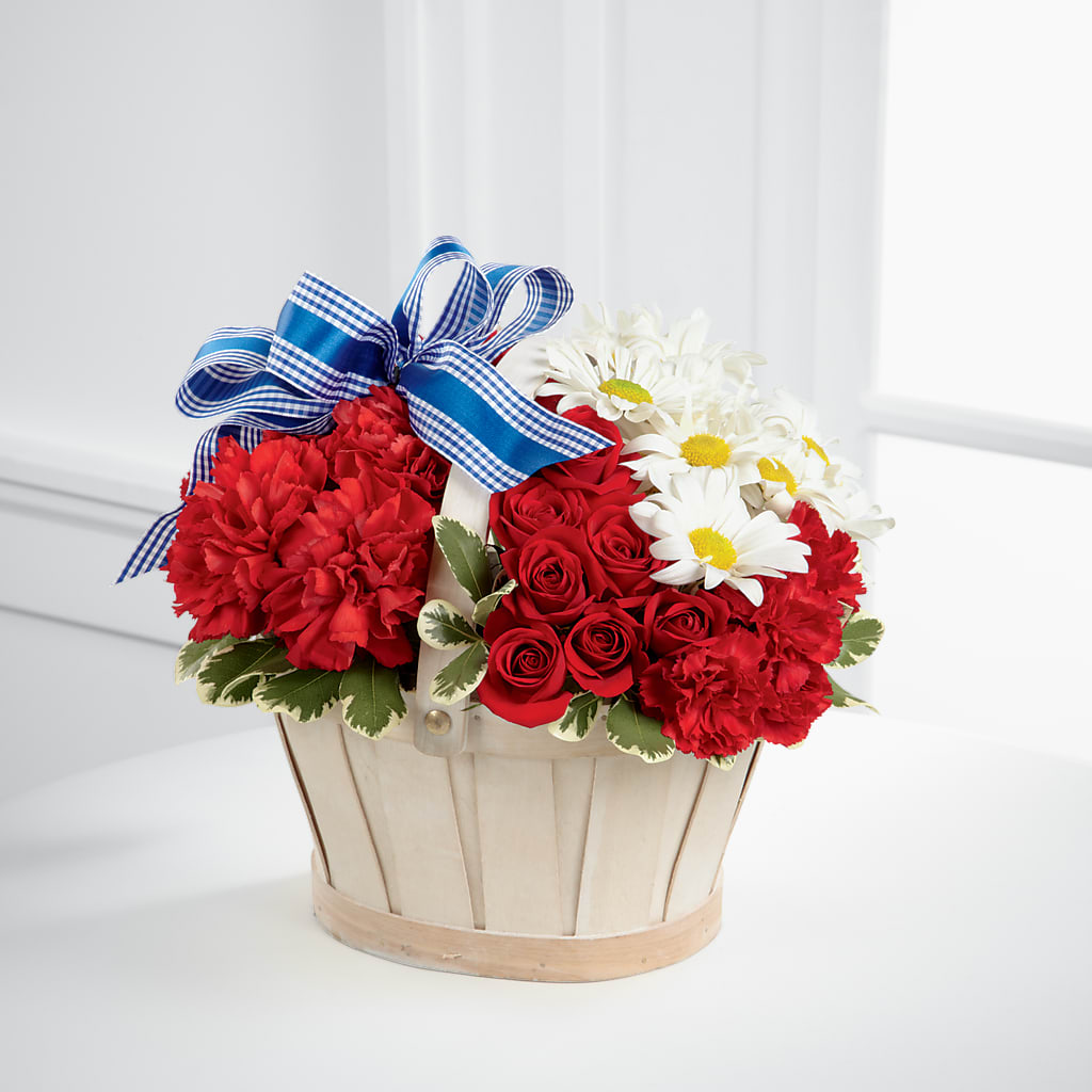Notre panier Justice est une parfaite illustration de la beauté patriotique. Des roses rouges, des œillets et des œillets miniatures sont agrémentés d'une gerbe de marguerites blanches, présentés dans un panier blanchi à la chaux, magnifiquement orné d'un ruban bleu design, pour une composition florale qui rendra justice à vos sentiments les plus sincères.