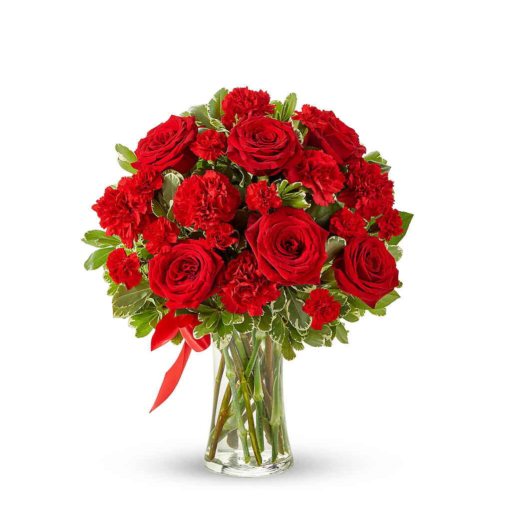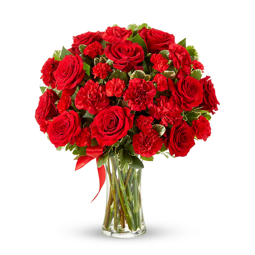 Laissez votre amour s'épanouir avec ce magnifique bouquet luxuriant. Cette composition florale toute rouge est composée à la main par un fleuriste près de chez vous, avec des roses rouges classiques et des œillets rouges. Toutes ces fleurs rouges font de ce cadeau une merveilleuse façon de montrer à l'être cher qu'il compte pour vous et que vous appréciez tout son amour. Les roses et les œillets rouges sont livrés dans un vase en verre transparent orné d'un ruban rouge.